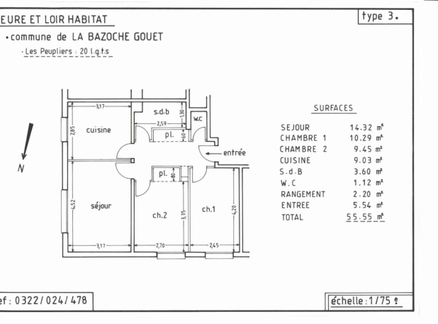 Situé en rez-de-chaussée, appartement de type 3 de 54 m² comprenant un séjour, 2 chambres, 1 salle de bain et un WC séparé.