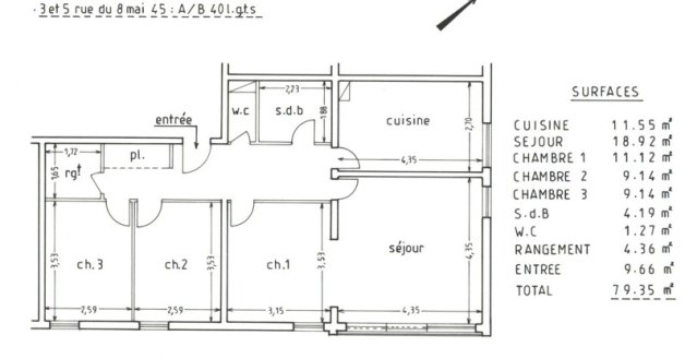 Situé au 4ème étage, appartement de type 4 de 79 m² comprenant un séjour,3 chambres, 1 salle de bain et un WC séparé.
